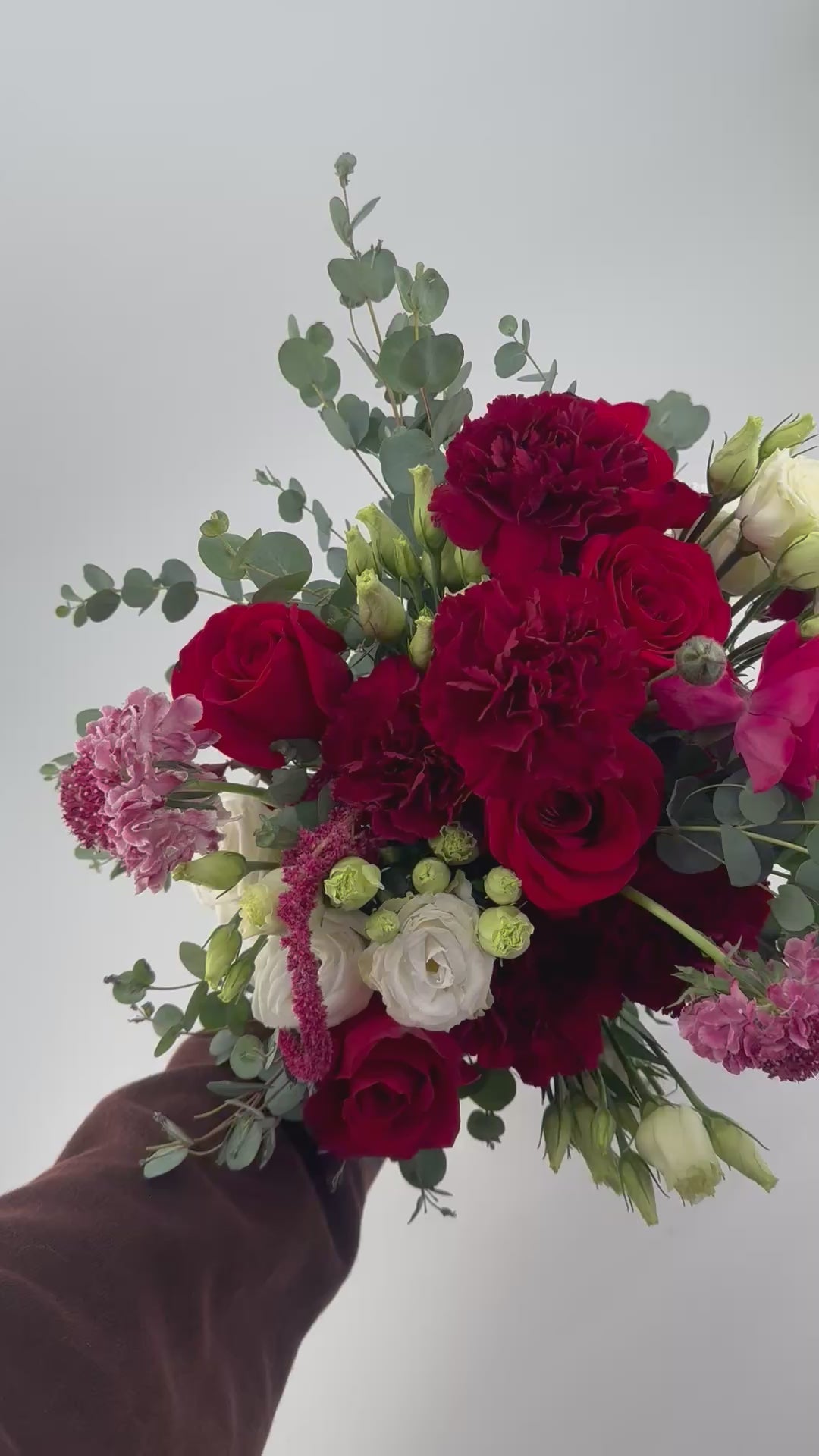 A medium hand-tied bouquet with moody romantic vibes. Roses and lisianthus are among the fresh blooms in burgundy, ivory, and red. Does not include a water source, so this is perfect for someone who has a vase ready, and a flair for romance.
